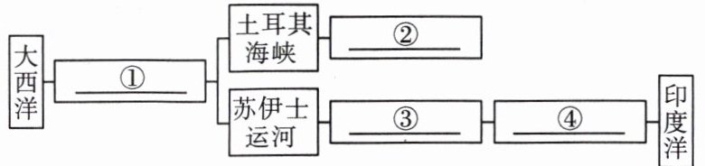 7.西亚地区位于亚洲西南部,被称为“三洲五海之地”。它自古以来就是东西方交通枢纽,战略位置极为重要。读西亚地区相互连通的海洋框架图,图中序号对应内容正确的是 (