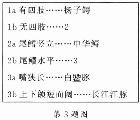 3. 长江江豚、白鱀豚、中华鲟、扬子鳄均属长江流域的珍稀物种。小温设计了一张检索表对这四种动物进行分类。依据检索表,下列属于白鱀豚和长江江豚共同特征的是 (