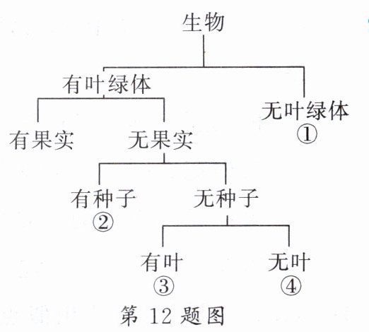 12. 如图是某同学建立的生物分类图,其中①~④各代表一种生物,下列哪组生物不符合该图分类 (
