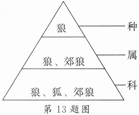 13. 如图是某同学归纳的狼在部分分类等级中的位置。据图分析正确的是 (
