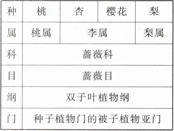 14. 早春时节,某地街头常见桃花、杏花、梨花、樱花争奇斗艳,令人赏心悦目。四种植物的分类关系如图,以下相关说法不正确的是 (