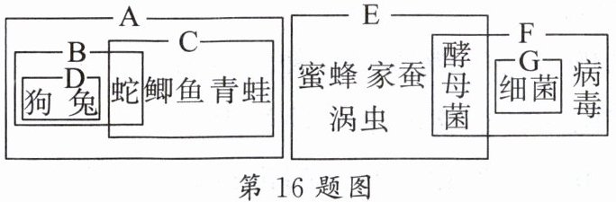 16. 如图是根据生物的相似点和不同点进行分类的图示(例如,D 类是以动物的体温基本恒定为依据进行分类的),请分析并回答问题。