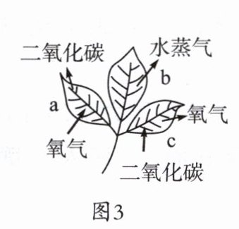 16. 近年来某地新建了许多水果、蔬菜采摘园。人们到大棚里采摘水果、蔬菜,既能亲近大自然,又能体验采摘的乐趣。图1表示在一定二氧化碳浓度和温度等条件下,二氧化碳的吸收量随光照强度的变化;图2表示密闭大棚内一天中二氧化碳浓度的变化;图3中a、b、c表示植物的三大生理作用。请回答下列问题。