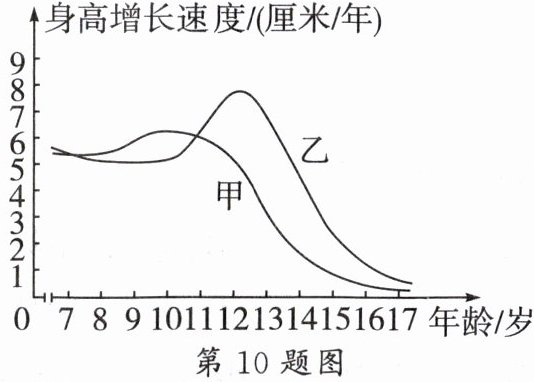 10. 某地男孩、女孩身高增长速度曲线如图。下列对曲线图的分析,正确的是 (