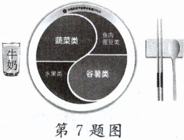 7. 如图是宣传合理膳食理念的“平衡膳食餐盘”示意图。下列叙述错误的是 (