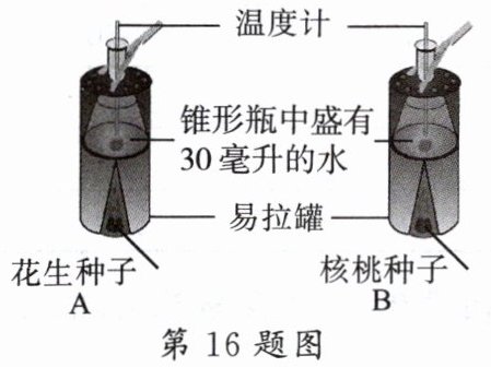 16. 某小组的同学想知道花生种子和核桃种子所含能量是否一样,他们设置了如图所示的实验装置进行探究。请根据实验分析回答问题(注:1 毫升水每升高$1^{\circ }C$,需要吸收 4.2 焦的热量)。