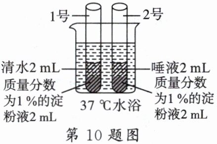 10. 同学们按如图所示进行实验,一段时间后向两支试管中分别滴加碘液,观察颜色变化。下列叙述错误的是 (