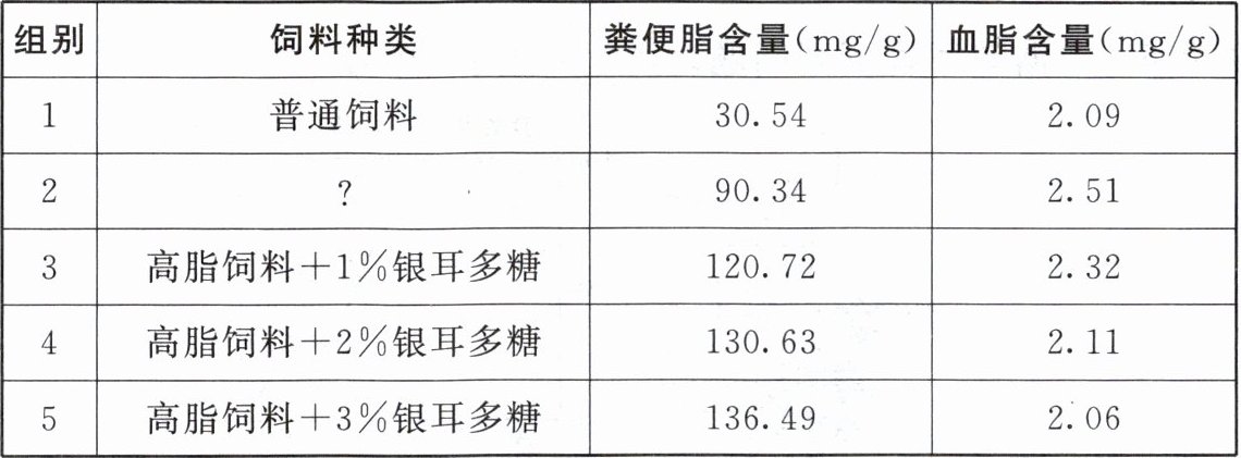 (2) 为进一步研究银耳多糖的保健功能,科研人员以健康小鼠为材料进行实验,实验处理一段时间后得到的结果如表所示。(高脂饲料为在普通饲料中添加一定比例脂类物质的饲料)