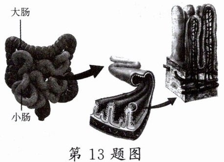 13. 若把一个成年人的小肠绒毛都展开铺平,它的表面积接近半个篮球场大小。如图是一段小肠、皱襞及小肠绒毛结构示意图。以下说法错误的是 (