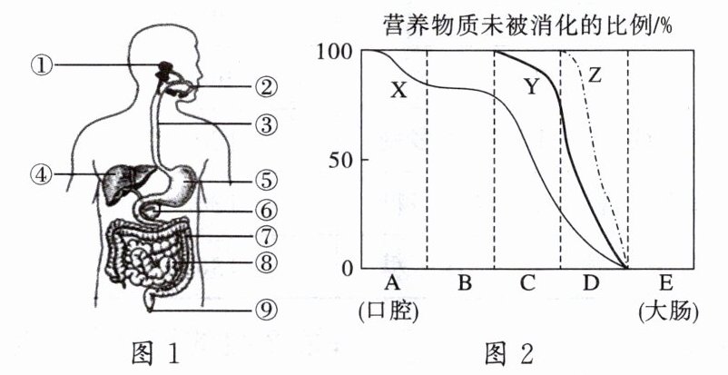 15. 图1表示人体消化系统的组成,图2表示三大营养物质在消化道中各部位被消化的程度,请据图回答下列问题。([___]内填序号)