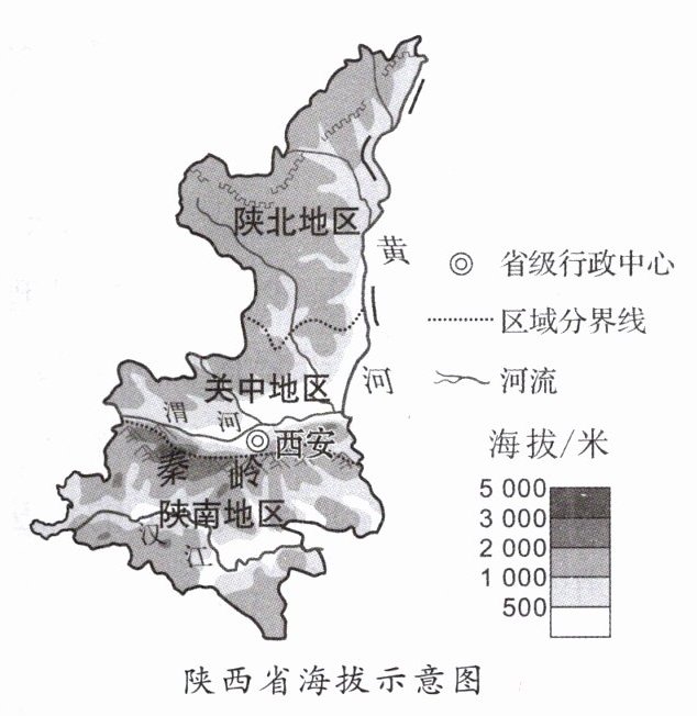陕西省自南向北分别划分为陕南地区、关中地区、陕北地区三个自然区。读右图,完成1~2题。