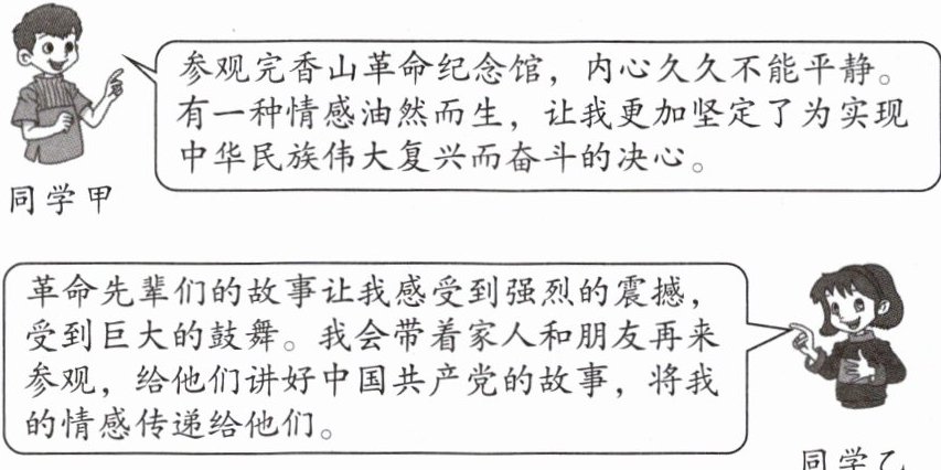 同学乙:参观过程中,我被一幅幅珍贵的图片、一件件实物所震撼,这种情感激励着我,我要把这次的所见所闻分享给家人和朋友,让更多人了解这段历史。
