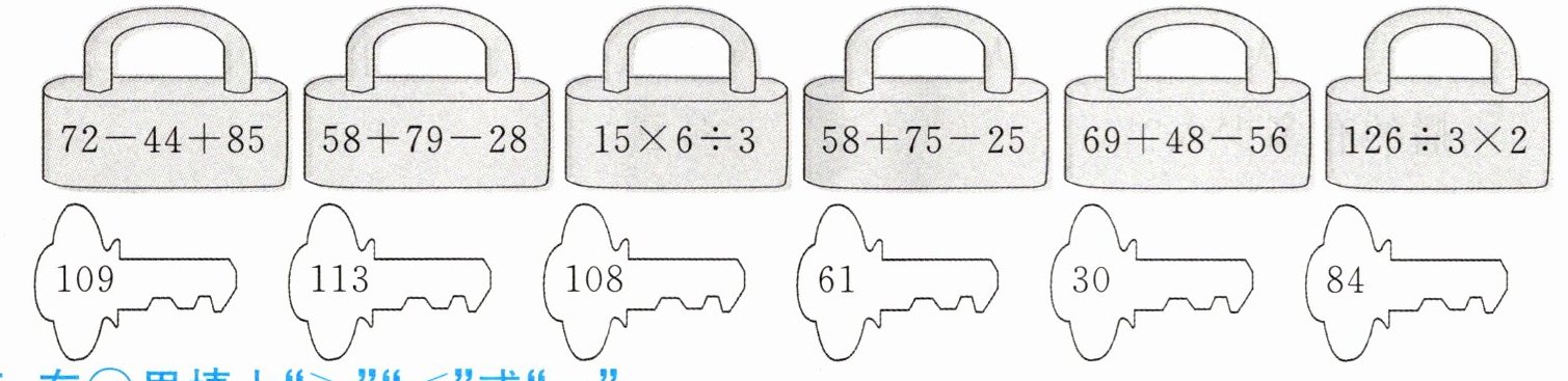 $72 - 44 + 85$连$113$;$58 + 79 - 28$连$109$;$15×6÷3$连$30$;$58 + 75 - 25$连$108$;$69 + 48 - 56$连$61$;$126÷3×2$连$84$