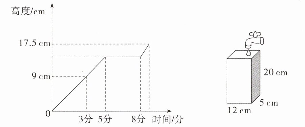 3. 新题型新思维 在一个高为20cm的空长方体内按照一定的速度注水,5分钟后关掉水龙头,又过了3分钟,在长方体内放入一块石头,石头完全浸没且水没有溢出。(水面高度变化如图)