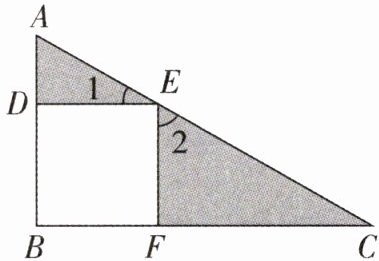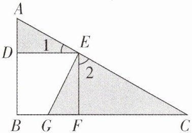 (2)DEFB 是一个正方形,$ \angle DEF $是一个直角,则 $ \angle 1 $与 $ \angle 2 $的和为 $ 90^{\circ} $,图形旋转前后对应角的大小相等,$ \angle GEF = \angle 1 $,那么 $ \angle GEC = 90^{\circ} $,有一个角为直角的三角形是直角三角形。