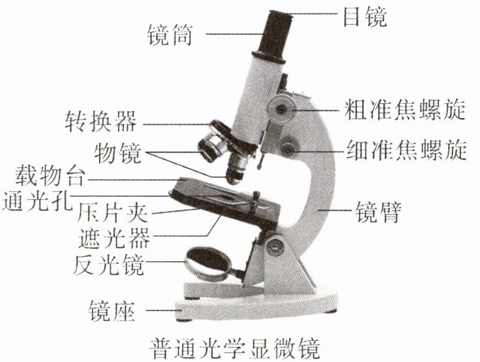 用透镜组合而成的显微镜叫作光学显微镜,普通光学显微镜的结构大体可分为支持部分、光学部分和调节部分。