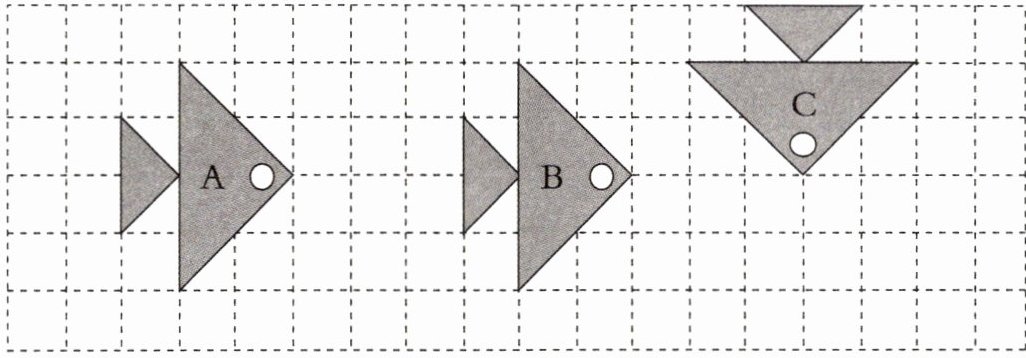 解:图形$A$先向右平移$6$格得到图形$B$,再绕图形$B$的直角顶点顺时针旋转$90^{\circ}$得到图形$C$。(答案不唯一,也可先旋转再平移等合理表述)