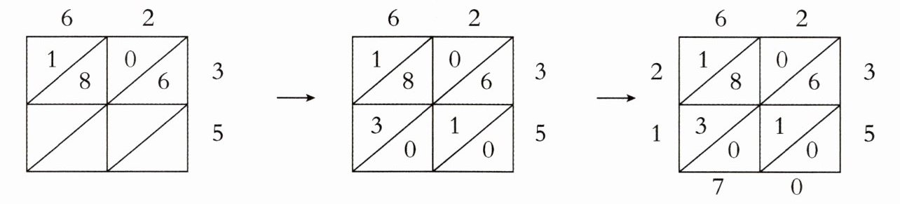 在数学发展的历史长河中,人们曾发明出很多关于乘法的经典计算方法,比如一种十分巧妙有趣的格子乘法,叫作“铺地锦”,下面就是“铺地锦”的格子乘法,你能看懂吗?