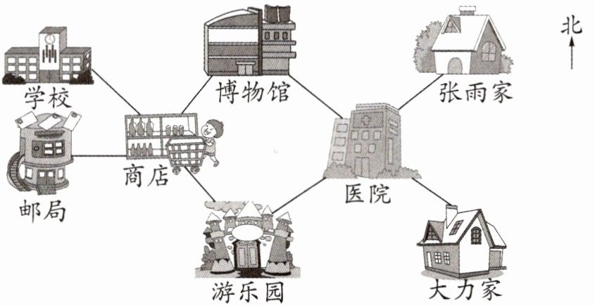 3. 大力想去张雨家玩,他需要先向( )方向走到医院,再向( )方向走,就能到达张雨家。
