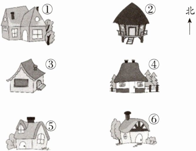 1. 大力家在张雨家的( )面,在医院的( )方向。