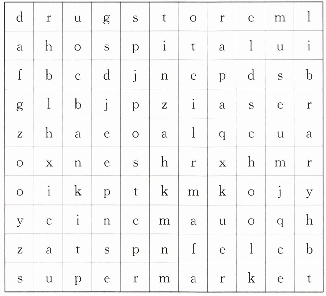 本题考查在字母方阵中找出特定场所的英文单词,考查对常见场所单词的拼写和识别能力,解题关键在于熟悉这些单词,并在字母方阵中按顺序圈出。