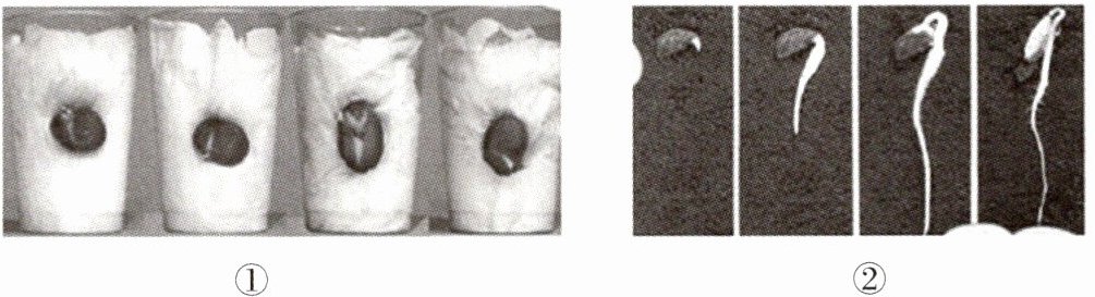 1. 为了看清种子萌发的过程,小丽在透明玻璃杯内垫了几层纸(如图①所示),她应该把种子放在______(填“杯子中央”或“杯壁和纸之间”)。