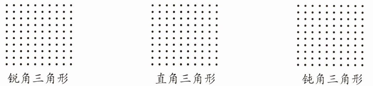 【解析】:本题考查对锐角三角形,直角三角形,钝角三角形的认识,并考查高的画法。首先,我们需要明确三种三角形的定义:锐角三角形是三个角都小于90度的三角形;直角三角形是有一个角等于90度的三角形;钝角三角形是有一个角大于90度的三角形。接下来,我们根据这些定义在点子图上分别画出这三种三角形。画高时,对于锐角三角形和钝角三角形,我们可以选择任意一边作为底,然后从底所对的顶点向底作垂线,这条垂线就是高;对于直角三角形,我们可以直接选择直角边作为底和高(因为它们是垂直的)。