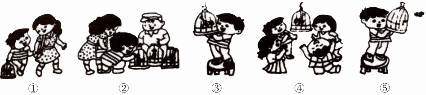 故事:一天,小明和小红在路上遇到一位老爷爷,发现老爷爷的鸟笼掉在地上,小鸟受伤了。他们帮老爷爷捡起鸟笼,把受伤的小鸟带回家照顾。几天后,小鸟的伤好了,小明和小红一起把小鸟放飞,让它回到大自然。