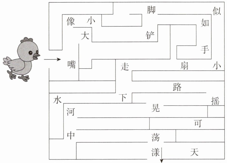 小鸡要去找朋友,你想知道它去找谁吗?只要走完迷宫,并以途中所经过的字作为谜面,猜一猜动物,就知道它的朋友是谁了。画出路线,并将谜面、谜底写下来。