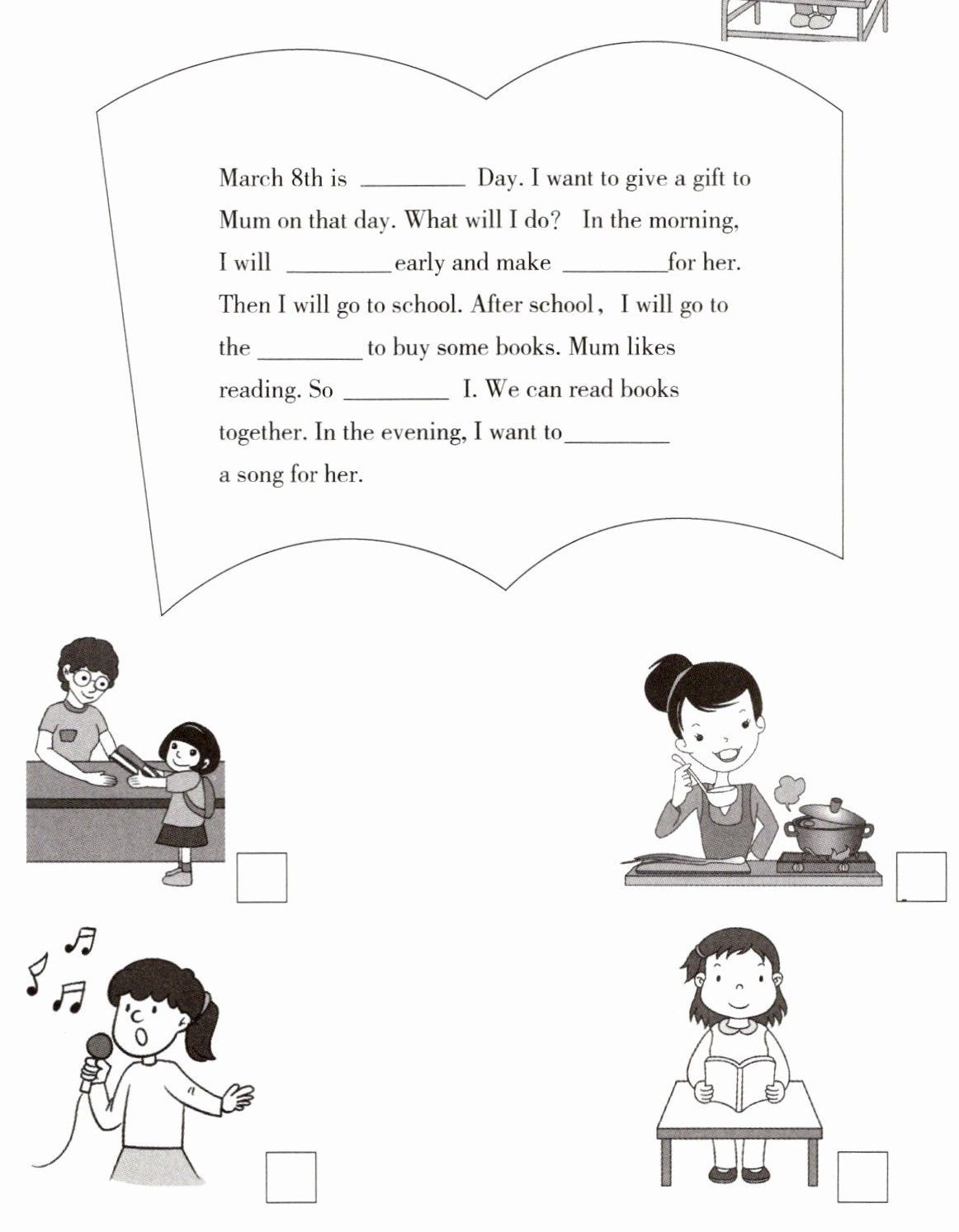 March 8th is $\underline{Women's}$ Day. I want to give a gift to Mum on that day. What will I do? In the morning, I will $\underline{get up}$ early and make $\underline{breakfast}$ for her. Then I will go to school. After school, I will go to the $\underline{bookstore}$ to buy some books. Mum likes reading. So $\underline{do}$ I. We can read books together. In the evening, I want to $\underline{sing}$ a song for her.