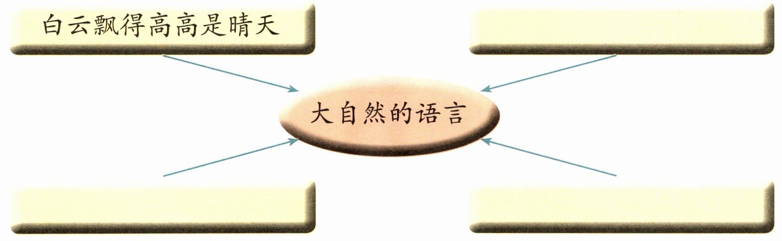 1 朗读诗歌,说说诗中介绍了哪几种大自然的语言,找一找、填一填,把下面的思维导图补充完整。