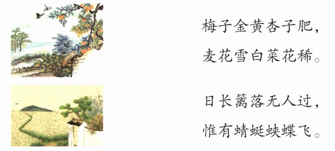 解析 本题考查学生的是对诗意的理解及评价鉴赏的能力。仔细观察图1,能找到蜻蜓、蝴蝶、屋舍、篱笆,这与第三、四两句诗中的“篱落”“蜻蜓蛱蝶”相对应;图2中有大片雪白的麦花、伸出围墙的杏子,与第一、二句中的“杏子肥”“麦花雪白”是相呼应的。