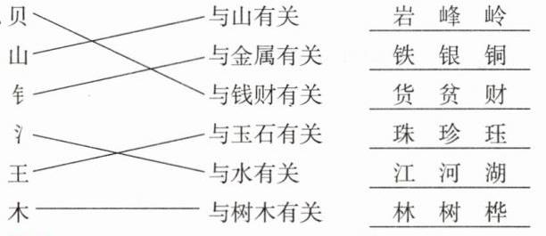 解析 本题考查学生评价鉴赏和迁移运用的能力。仔细观察例子,就能发现左边一列是偏旁,右边一列是该偏旁表示的意思,需要一一对应连起来。最右边一列考查学生的是相应偏旁的生字积累情况,如果一时想不出来,可以试着在短文中寻找。