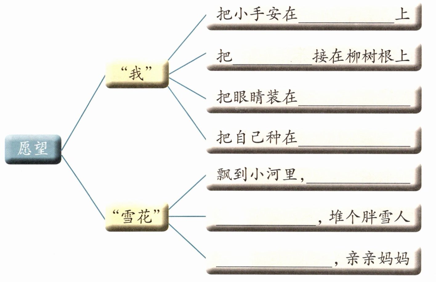 1 两首诗歌中,“雪花”和“我”都有哪些愿望呢?阅读两首诗歌,把导图补充完整。