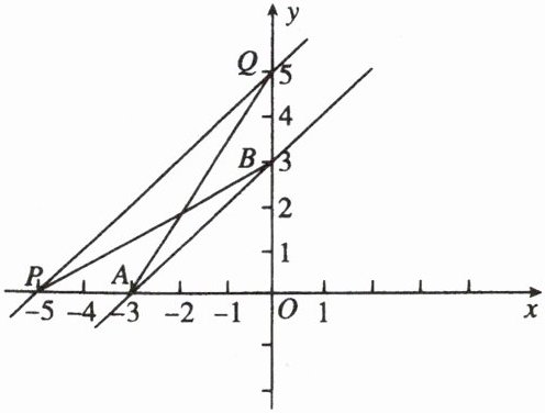 因为${S}_{\triangle PAB}=\frac{1}{2}×\vert PA\vert×3 = 3$,$\vert PA\vert = 2$,又$A(-3,0)$,所以$P(-5,0)$;因为${S}_{\triangle QAB}=\frac{1}{2}×\vert QB\vert×3 = 3$,$\vert QB\vert = 2$,又$B(0,3)$,所以$Q(0,5)$。