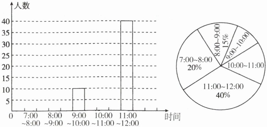 **补充条形统计图**:在条形统计图中,$7:00 - 8:00$对应纵坐标$20$,$10:00 - 11:00$对应纵坐标$15$。