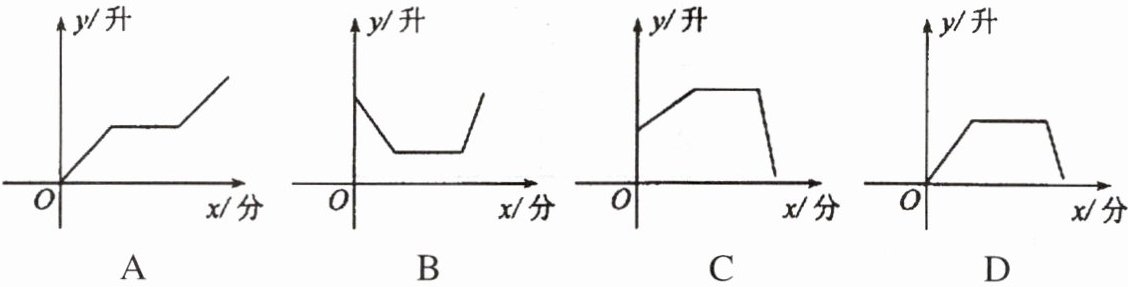 3. 打开某洗衣机开关,在洗涤衣服时(洗衣机内无水),洗衣机经历了进水、清洗、排水、脱水四个连续过程,其中进水、清洗、排水时洗衣机中的水量y(升)与时间x(分)之间满足某种函数关系,其函数图象大致为(
