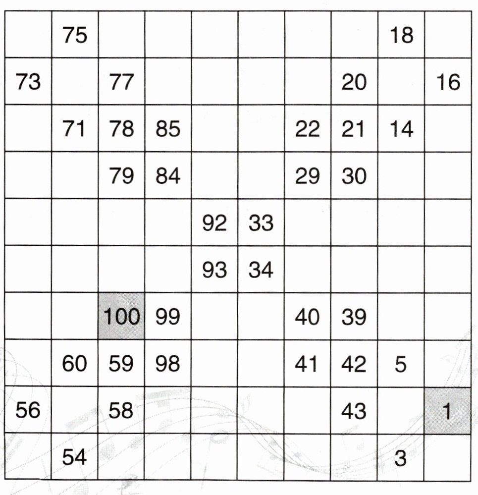 小白喜欢在10×10的方格纸上涂鸦。有一次,他把数字1到100既无重复又无遗漏地填入方格纸中,并且相邻的数字所在的方格也都是相邻的。小白想为难一下小胖,就把一部分数字用修正贴挡住了,你能帮小胖把挡住部分的数字填出来吗?