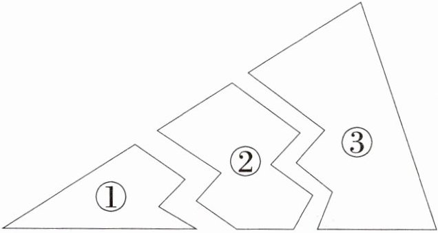 2. 在做实验时,刘云不小心把一块三角形的玻璃隔片打碎成三块(如下图所示)。现在老师要到玻璃店去配一块形状、大小完全一样的玻璃,出于自身安全考虑,他只想带一块破碎的玻璃去。你觉得老师应该带哪一块去呢?说一说你的理由。