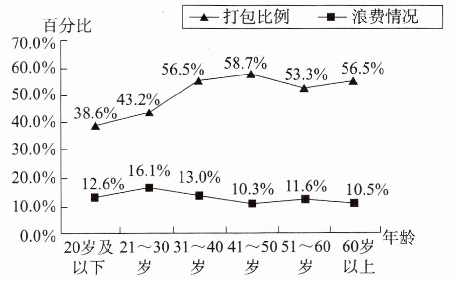 2012年2月人民网曾在全国范围内针对“舌尖上的浪费”展开大规模的民意调查。下图是不同年龄段人群打包比例、浪费情况的调查统计图。