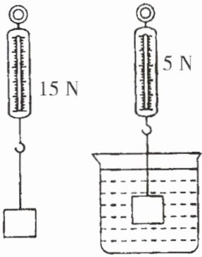 3. 如图,某物块用细线系在弹簧测力计下,在空气中称时示数是 $15N$,浸没在水中称时示数是 $5N$,则此时物块受到水的浮力为