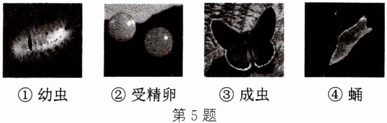 5. 新情境 地域特色 云南红河蝴蝶谷有400多种蝴蝶,蝴蝶种类数位居世界第一。如图所示为蝴蝶发育的几个阶段,蝴蝶发育的过程应为(