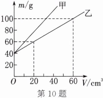 10. 在两只相同的烧杯中分别加入甲、乙两种液体。测得烧杯与液体的总质量m和液体体积V的关系如图所示。下列说法中,正确的是(