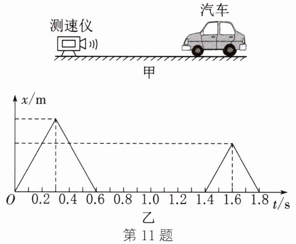 11. 交通部门常用测速仪来检测车速,测速原理是测速仪前后两次发出并接收到被测汽车反射回来的超声波信号,再根据两次信号的时间差,测出车速,如图甲所示。某次测速中,测速仪发出与接收超声波的情况如图乙所示,其中x表示超声波与测速仪之间的距离。下列说法中,错误的是(假设超声波的速度为340m/s,且声速与车速均保持不变)(