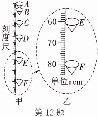 12. 在测量纸锥下落速度的实验中,小明用每隔0.5s拍摄1次的相机拍摄出如图甲所示的照片,如图乙所示为纸锥从E到F过程的放大图。