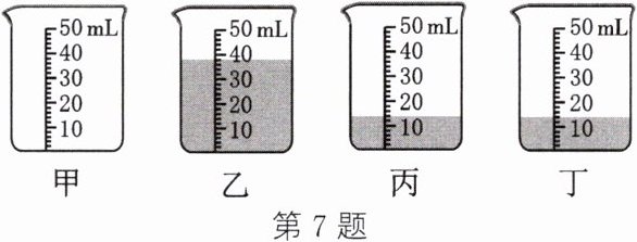 7. 为研究氧化石墨烯薄膜的物理特性,科学家做过这样一组实验:① 将氧化石墨烯薄膜覆盖在有刻度的空烧杯的杯口上,如图甲所示,并测得总质量为$20g$;② 将薄膜揭开,向烧杯内倒入酒精与水的混合物,盖紧薄膜,如图乙所示,测得总质量为$57.2g$;③ 一个月后,通过检查发现薄膜覆盖紧密,烧杯内液体的体积明显减小,如图丙所示,测得此时总质量为$31.2g$;④ 之后烧杯内液体的体积保持不变,如图丁所示。请分析并回答下列问题:(已知${\rho }_{酒精}= 0.8× {10}^{3}kg/{m}^{3},{\rho }_{水}= 1.0× {10}^{3}kg/{m}^{3}$)