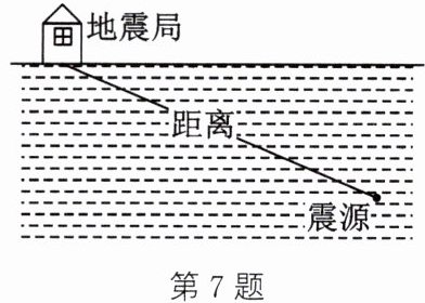 7. 地震时,震源处同时产生并向各个方向发出纵波和横波,纵波的传播速度取$7×10^3m/s,$横波的传播速度取$3.5×10^3m/s。$如图所示,某市地震局于当日21:46:07探测到纵波,于当日21:46:09探测到横波。求: