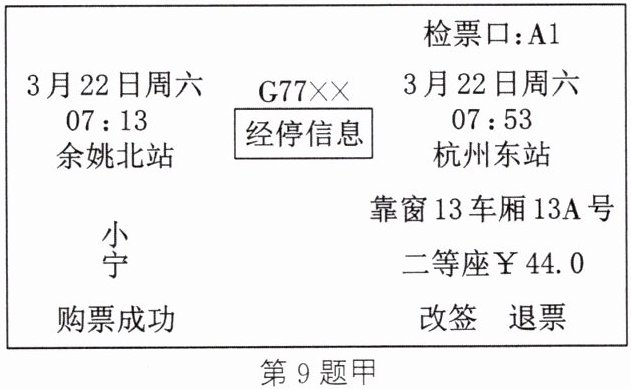 9. 新情境 生活体验 当前中国已经进入高铁时代,高铁已成为许多人长途出行的首选。小宁一家周六从余姚出发前往位于杭州的姑姑家,如图甲所示为小宁的网络购票信息。