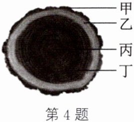 4. 松材线虫病被称为“松树癌症”,松材线虫通过松褐天牛传播,寄生在木质部,会破坏细胞,导致松树枯死。如图所示为松树茎的横切面,松材线虫寄生的部位是 (
