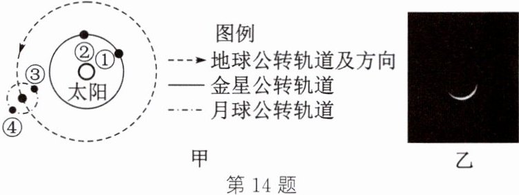 14. (宁波模拟)2023年3月24日,天空上演“月掩金星”现象,我国大部分地区可观测到该现象。“月掩金星”是指月球、地球、金星排成一条直线时,金星被月球掩盖的自然现象,如图甲所示为部分天体及其运行轨道示意图,图乙是宁波某网友当日观察到的景象。据此回答下列问题: